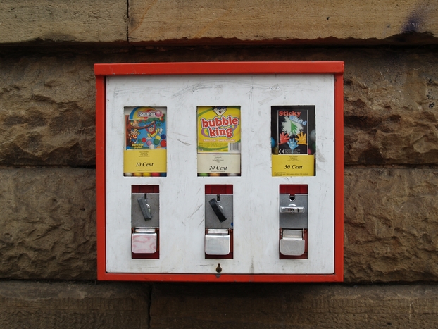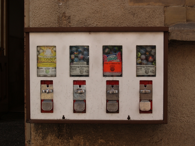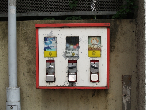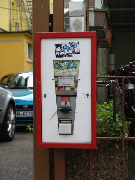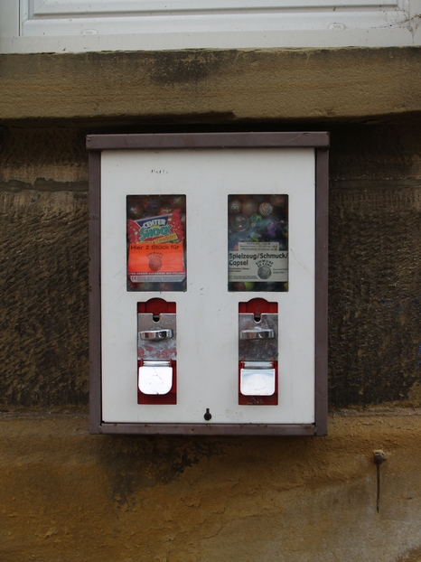 An der Kreuzung Karl- / Wein- / Bahnhofstraße sammeln sich ganze vier Kaugummiautomaten. Dieser vierkammerige befindet sich in der Karlstraße.