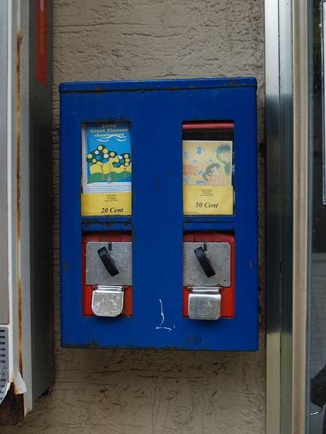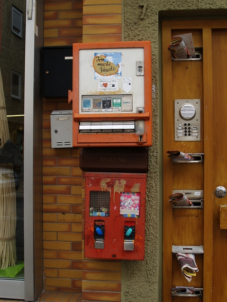 In der Ortsmitte von Calmbach (Stadt Bad Wildbad, Landkreis Calw) hat sich in der Hauptstraße dieser schöne alte Kondomautomat mit Schubladen erhalten. Die Preise sind noch in DM angegeben, er scheint also schon seit einem Jahrzehnt außer Betrieb zu sein. Darunter befindet sich eine Zeitungsrolle und ein Kaugummiautomat mit bunten Drehgriffen. Die Aufnahmen entstanden am 21. Oktober 2011.