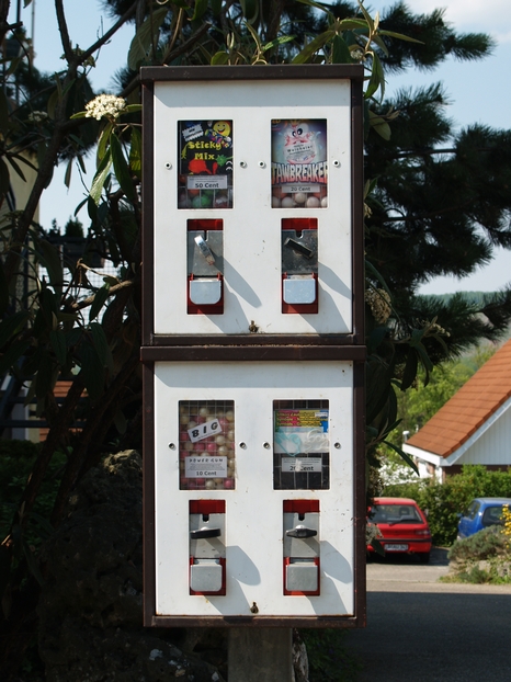 Kaugummiautomaten an der Dorfstraße in Ochsenbach (Stadt Sachsenheim, Landkreis Ludwigsburg). Aufgenommen am 22. April 2011.
