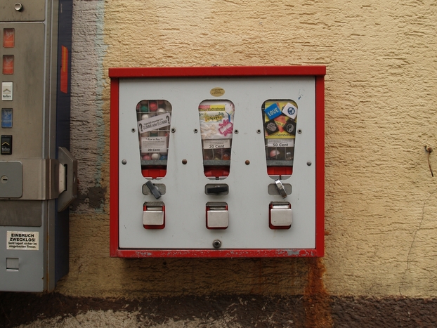 In Vaihingen an der Enz (Landkreis Ludwigsburg) sind neben gewöhnlichen Kaugummiautomaten auch zwei interessante grüne Süßwarenautomaten der in der ganzen Region umtriebigen Firma Hans Dieterle aus Schützingen anzutreffen. Einer davon hängt an diesem mit Schieferschindeln verkleideten Haus in der Grabenstraße, gemeinsam mit einem vierkammerigen Kaugummiautomaten.