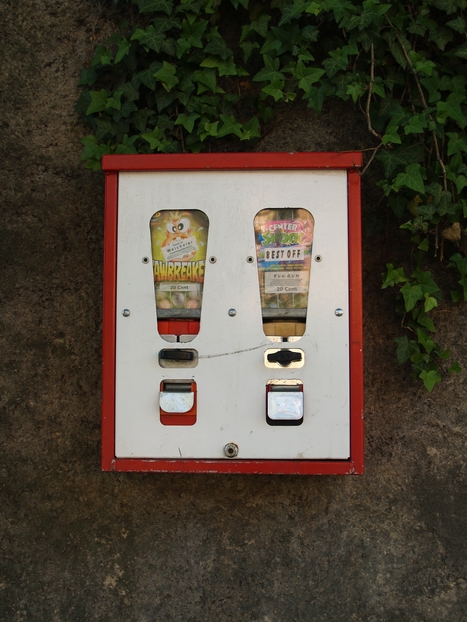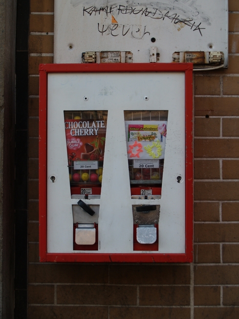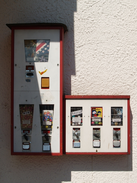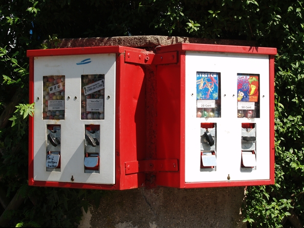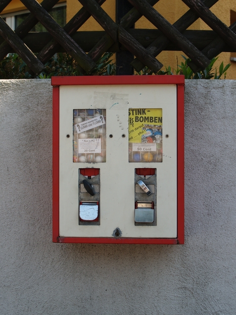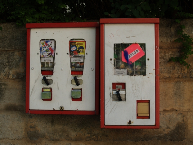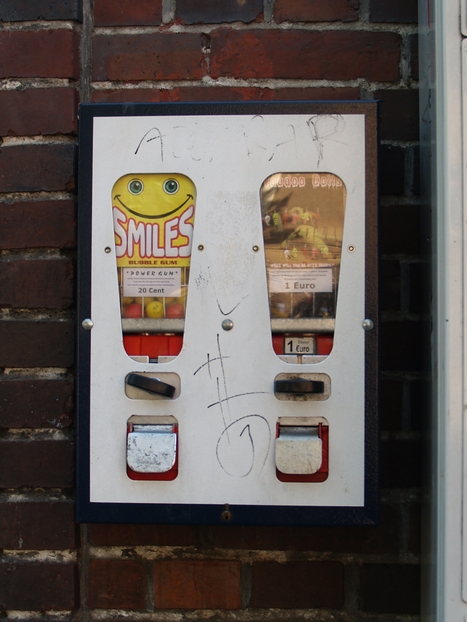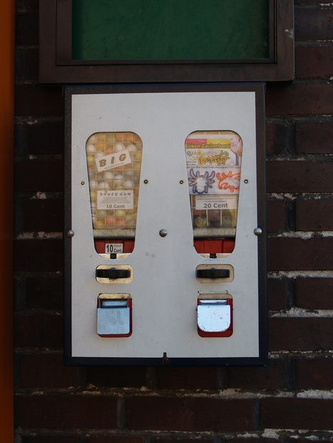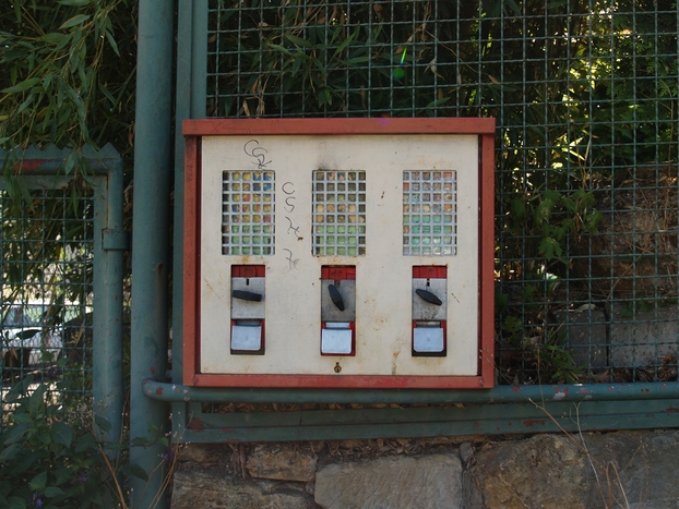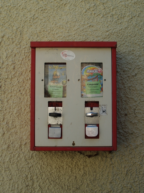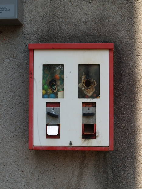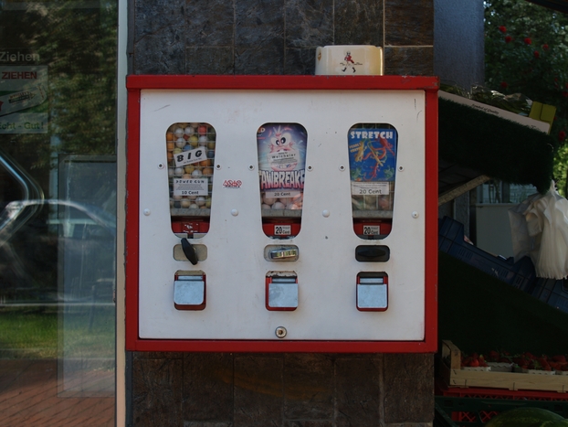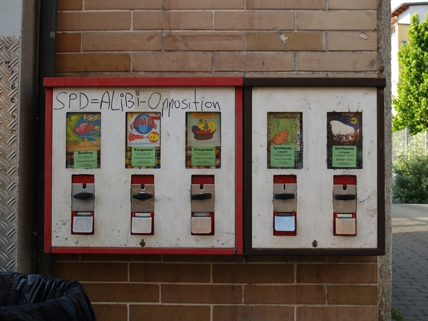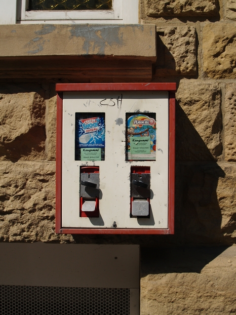 Nicht mehr ganz aktuell ist die Bemerkung auf dem linken der beiden. Gleich hinter dem Penny-Markt befindet sich ein weiterer Kaugummiautomat: