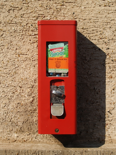 An der Ecke Hindenburg- / Bismarckstraße in Leonberg-Eltingen (Landkreis Böblingen) befindet sich dieser einkammerige Kaugummiautomat der im ganzen Großraum Stuttgart agierenden Firma Raphael Sahm aus Herrenberg. Rechts um die Ecke sowie links davon ist je ein dreikammeriges Exemplar anzutreffen. Aufgenommen am 3. Oktober 2011.