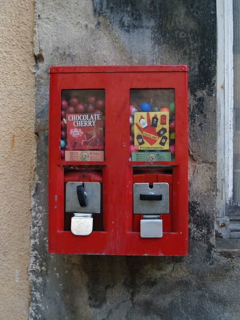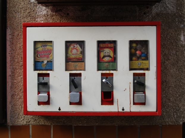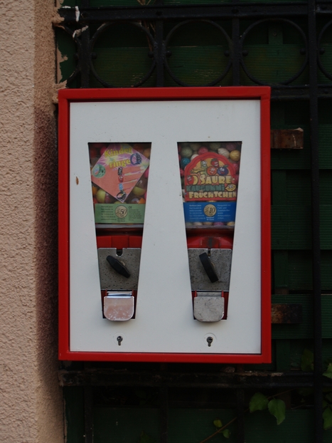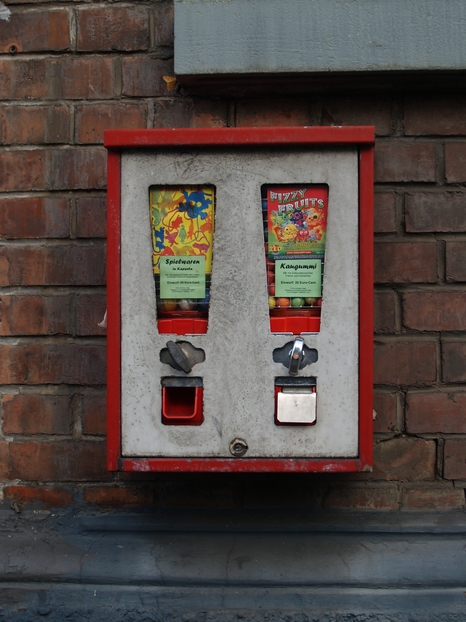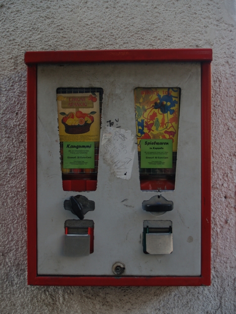 Der Automaten-Rundgang durch Geislingen an der Steige (Landkreis Göppingen) beginnt beim Bahnhof, wo dieses schöne Schild zur Einkehr einlädt. Direkt gegenüber des Bahnhofsgebäudes befindet sich an der Unterführung dieser dreikammerige Kaugummiautomat, der auf unübliche Weise auf einem Betongeländer angebracht ist: